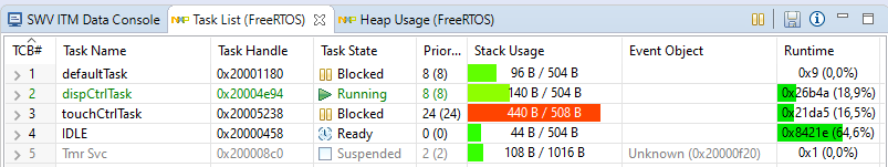 Now after you put everything in place, it is time to run your code. Start the project in debugging mode, make the FreeRTOS/Task List view visible and let it run for some seconds. Then hit the pause button. The task list will collect the information from your target (from GDB) and show it nicely: