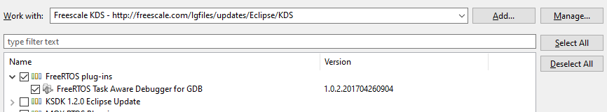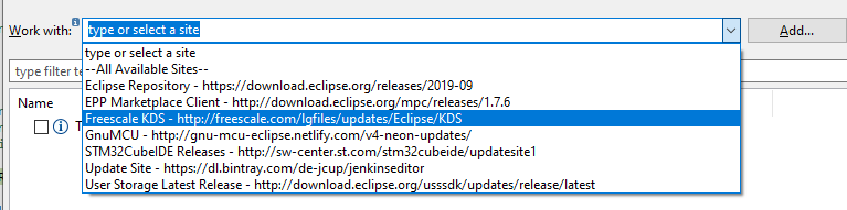 Then add an Update Site by clicking the "Manage"-Button. Here you need to add the update site from freescale. And yes, NXP/Freescales plugin works with STM's CubeIDE :-)