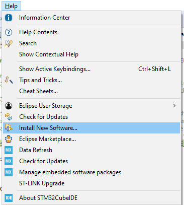 First start STM32CubeIDE and go to Help -> Install New Software...