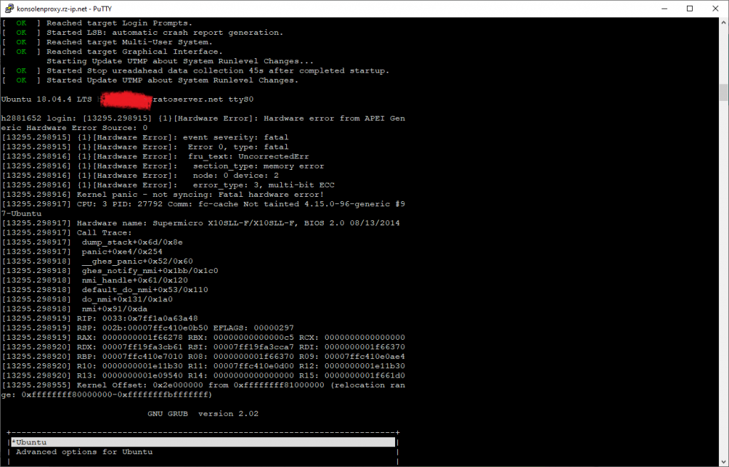 While installing some stuff on a dedicated server at Strato, I encountered a problem with the server two times. While having no clue what happened during the first time, I was prepared during the second. I kept a connection to the serial port proxy of my provider open, to see the most low level messages (kprints).