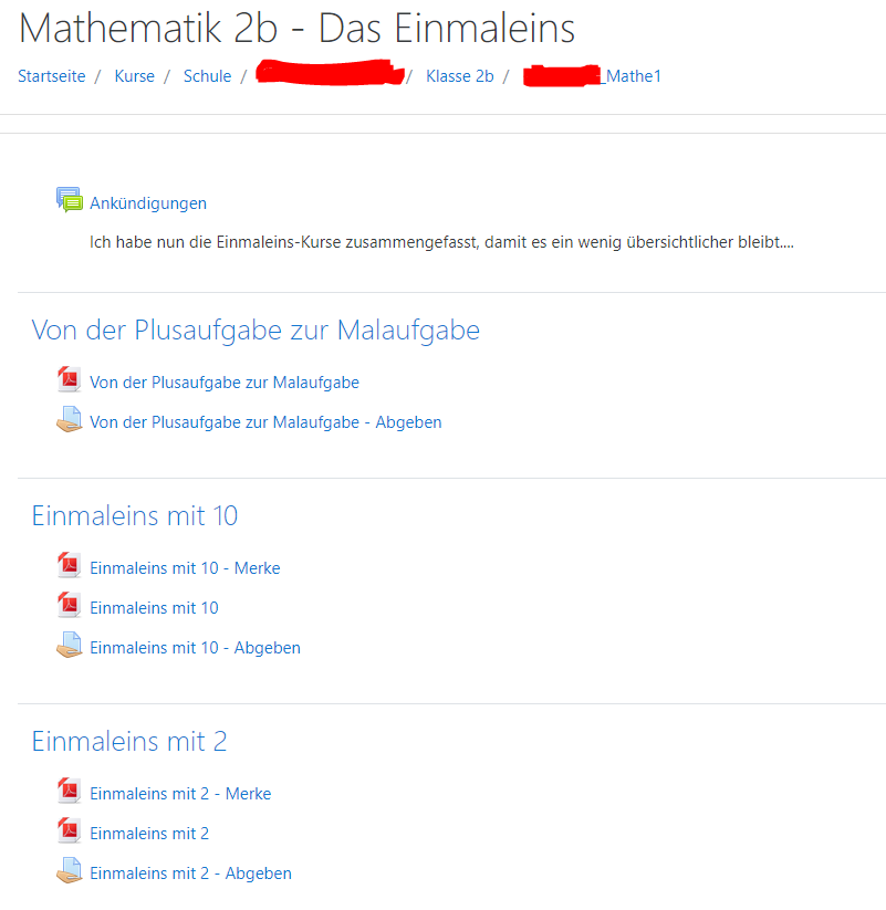 Here a little hint, how a course could look like with content (Tasks in PDFs and a place to put the pictures of the task sheet in).