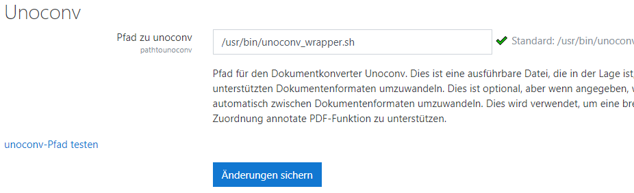 Now enable unoconv and adjust the path settings in the moodle unoconv configuration to point to the wrapper /usr/bin/unoconv_wrapper.sh