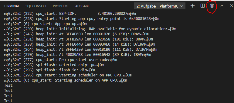 Despite the fact, that printf debugging is somewhat frowned upon, it is a very practical first step. And with platform.io and evaluation boards like this one, it is as easy as pressing a button. No additional wiring, no hassle with pins, ports or blown up code. We already prepared the test in our code above. It prints "Test" every second on the serial console, just that we can not see it yet. For this to show up, you need to open the serial monitor:
