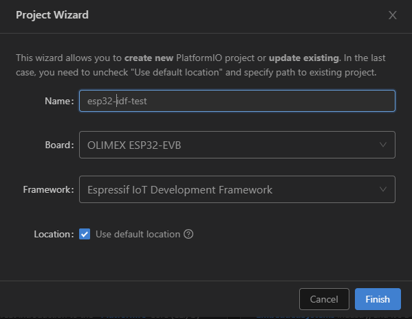 As shown in the below screenshots, create a new project VSCode -> The PIO-Icon -> New Project, define a project name, select Olimex ESP32-EVB with ESP-IDF framework and press Finish. After PIO downloaded all dependencies and configured your project, we are ready to go!