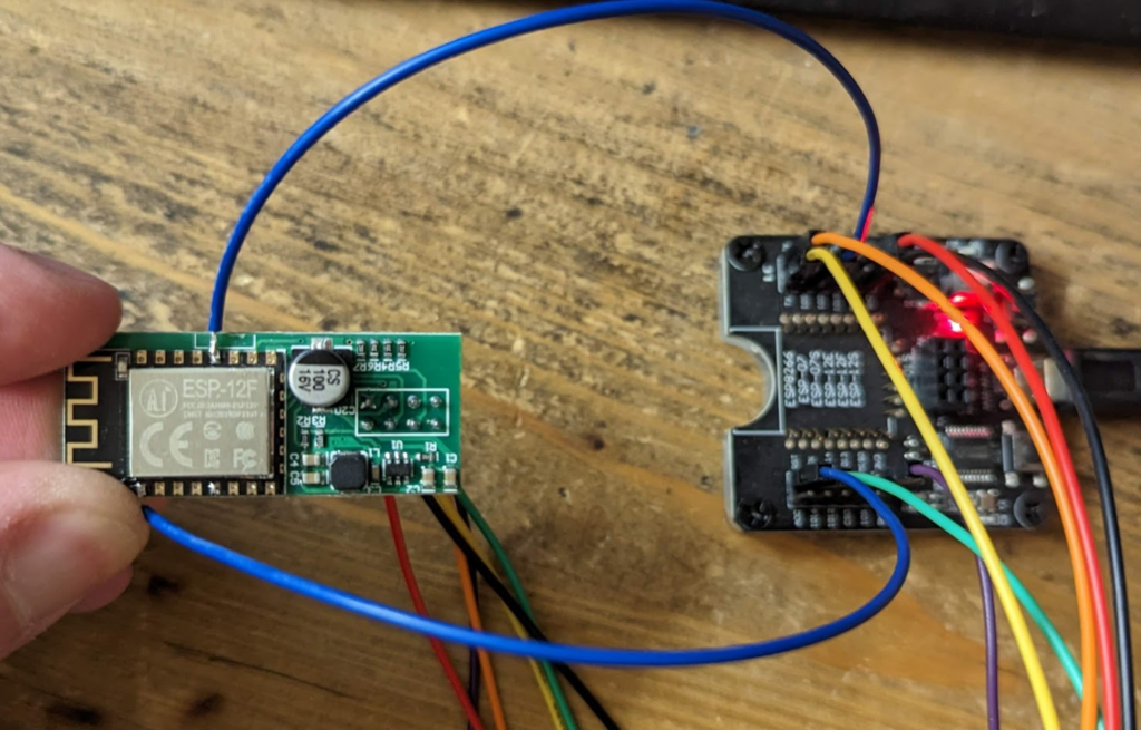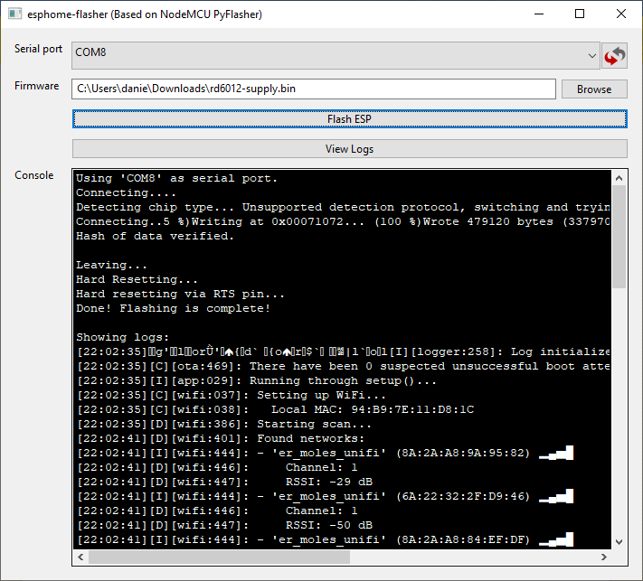 Now we will upload some ESP firmware. Since initial programming with ESPhome did not connect to the module, I downloaded it for manual flashing (modern image format) and used esphome-flasher to get it onto the device (later you can just use OTA):