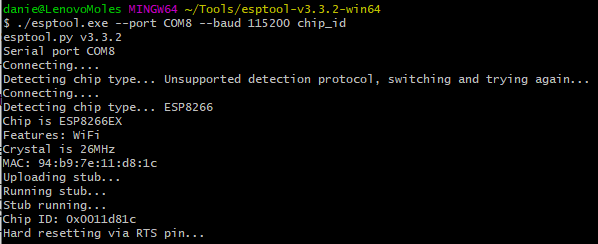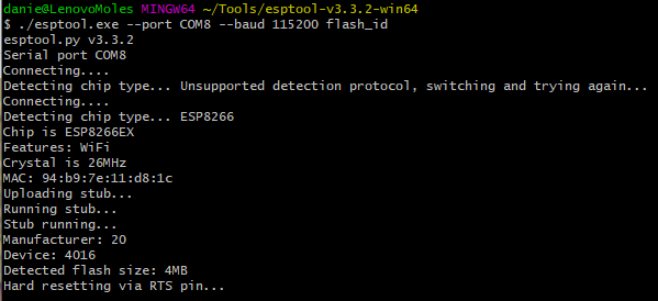 When you now try to connect to the ESP reading the flash_id, you get the following: