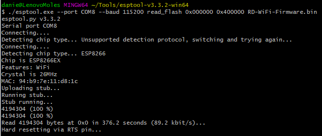 With knowing the flash size (from the flash_id command), we can decide on the read_flash command (4MB = 0x400000) to take a backup of the original firmware (this is just boring, because it simply does not work well with Joy-IT application). The read-out will take about 5 minutes: