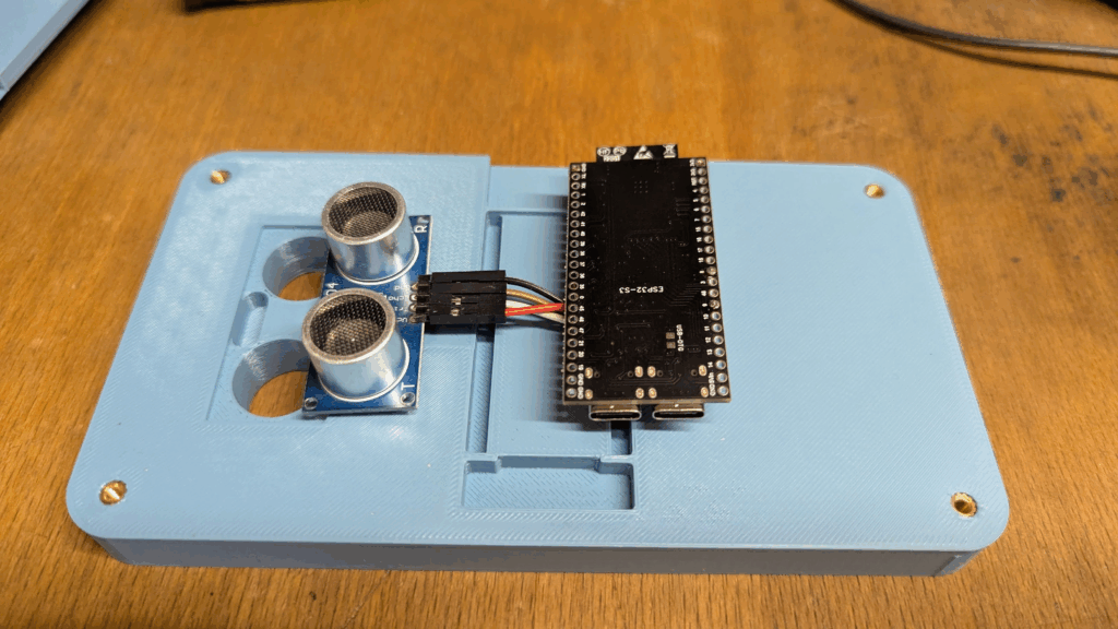 Because this is not just any molehill. I installed an ultrasonic sensor pointing down into the pit, connected to an ESP32-S3, prototyped it with ESPhome. This was crazy fast, just using seven lines of yaml code in ESPhome (not counting the boilerplate to connect the device)