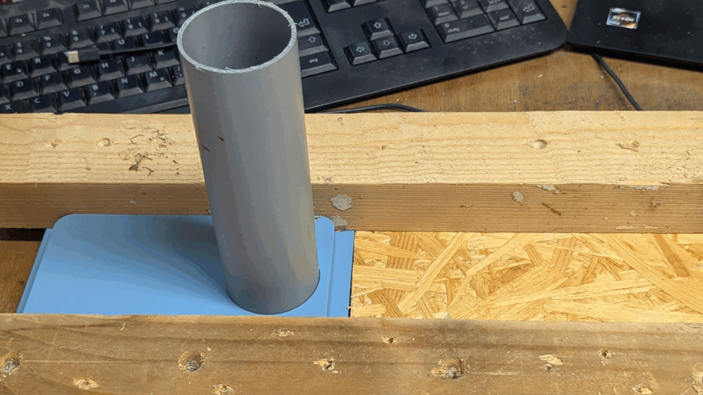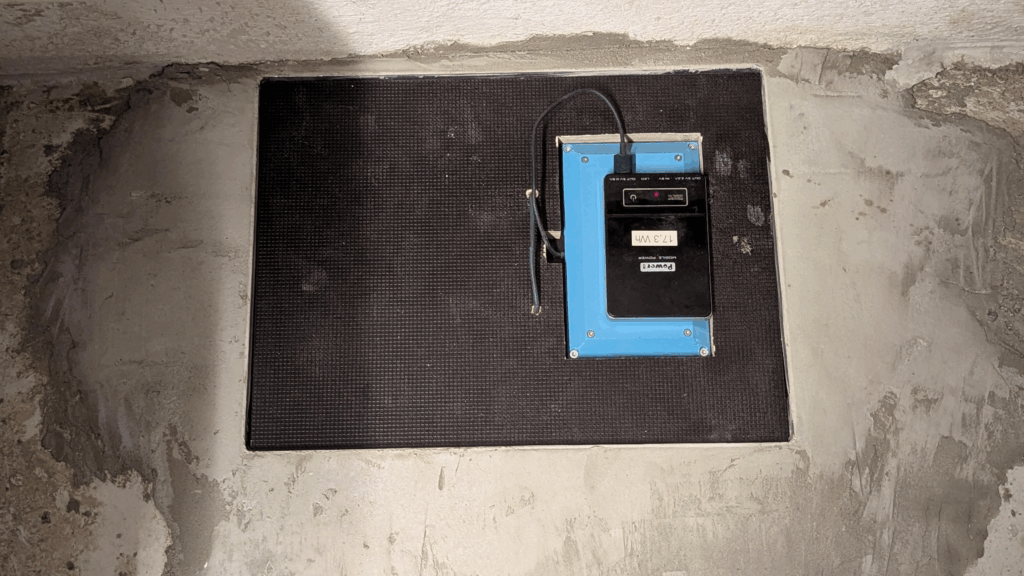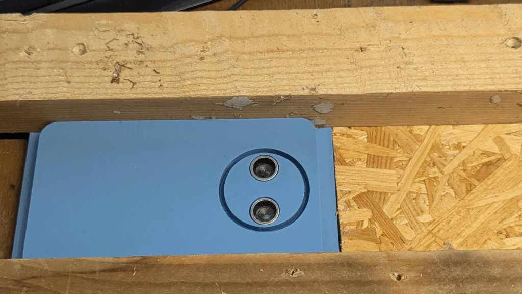 Inside the frame sits a robust two-layered phenolic resin board (some call it “Siebdruckplatte”, I call it waterproof magic), precisely cut to host the ultrasonic sensor housing. The whole thing is flush with the floor (not now, but when I added plates to the floor after kicking out the fossil burning stove), strong enough to survive stampedes, and still allows perfect measurements.