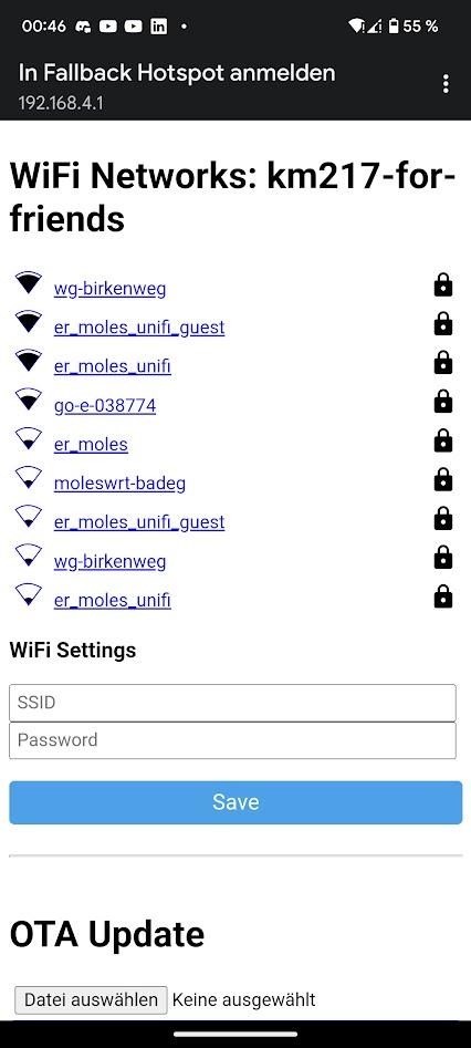 I configured the ESPhome firmware to run a captive portal after approx one minute. So, after powering the board, you could (after one minute) connect to the SSID "Fallback Hotspot". Turn of your cellular internet (it disturbs the WiFi very often) and select the Fallback (password is "Z8zfajgxVvNw"). When WiFi of your phone is connected (sometimes you need some tries), a pop-up should ask you to sign in to the network. Follow this. It will present the portal of the ESPhome firmware and show you all WiFis it has found. Select the appropriate one and enter the password of this WiFi.