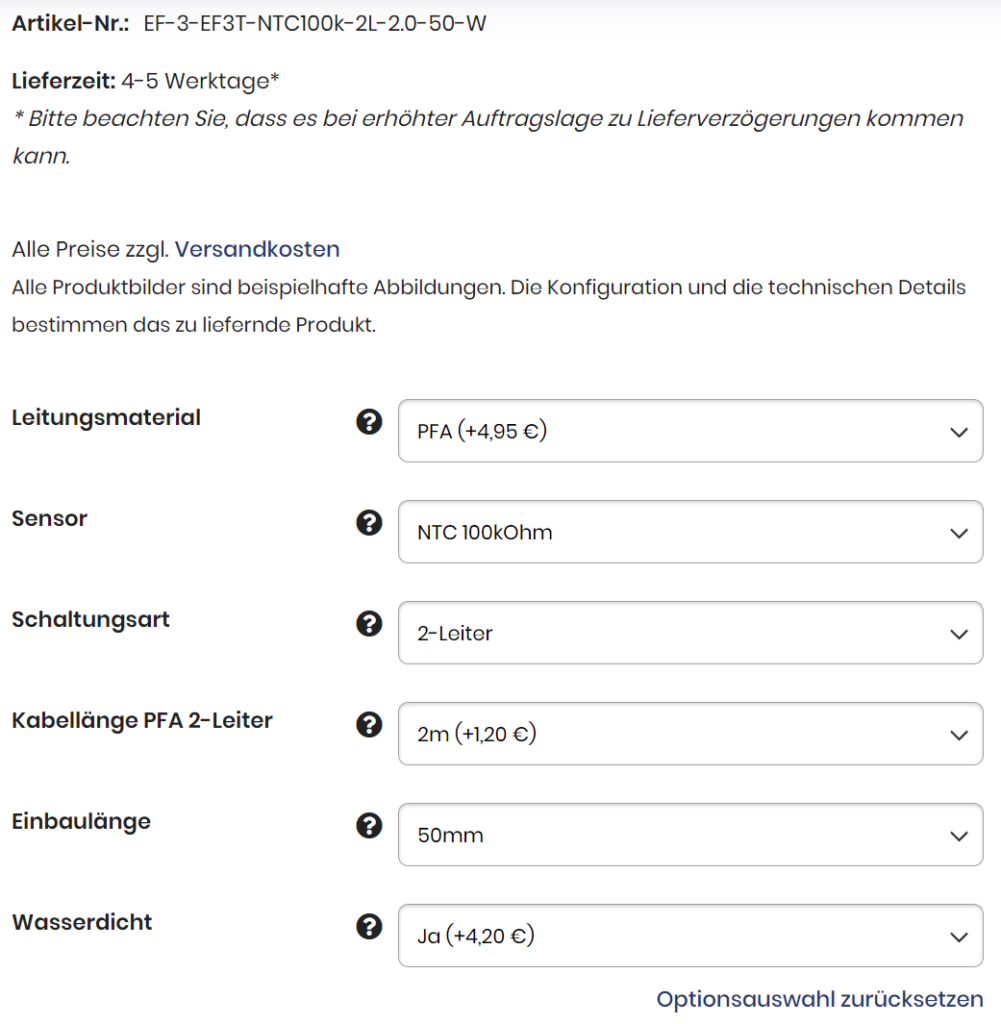 The Exhaust sensor is a simple 100 kOhm NTC-Resistor type, as you can order it e.g., at sensorshop24. In my case, I select the following options: